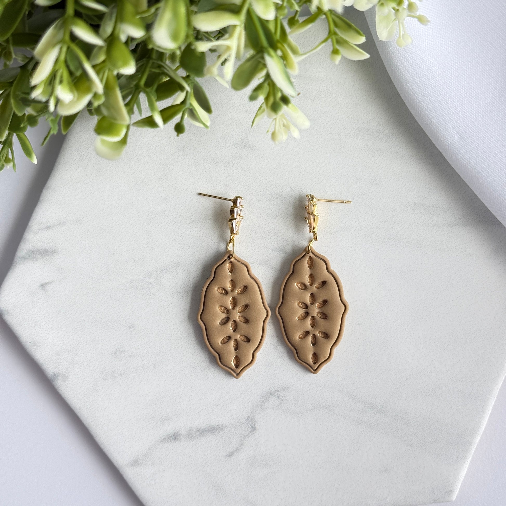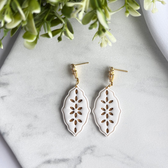 Elegant, warm, and effortlessly wearable—these handmade latte polymer clay earrings are designed to elevate your everyday style. Featuring a soft neutral tone with delicate cutout detailing and refined gold-tone accents, this pair brings subtle statement appeal without feeling heavy.